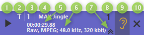 | 1 | Play/Stop button | Start playback for prelistening. (while playback the button changes to a Stop button) |