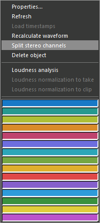 Audio items in the clipboard that contain stereo signals can be split into two separate one-channel files. These one-channel files are stereo files nevertheless, but each channel contains the signal from only one stereo channel of the original file.