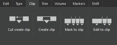 | Cut create clip | Creates a clip from the selected time range, which is added to the Clipboard with a user-defined title. Cut the selection off, then shift tracks' content to fill the gap. |