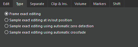| Frame exact editing | All editors are able to cut not only linear, but also compressed audio formats in a sample correct way.This option allows cutting at the edges of the MPEG frames. |