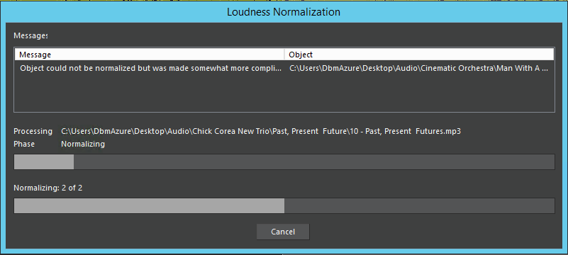 If the audio is “not correctable” the normalization will be done as close as possible to the “compliant” state. A message informs about the suggested volume adjustment.