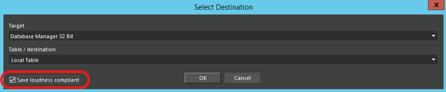 When saving audio to DBM or file system, a check box appears in the Select Destination dialog. If checked, the editor will try to create a loudness compliant audio while saving.