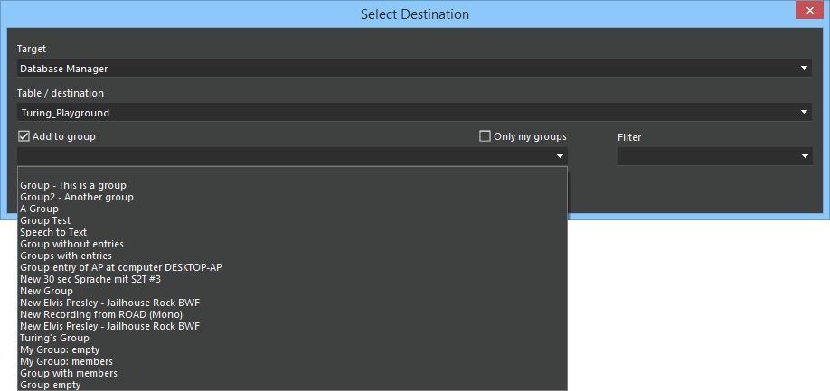 Once you have selected the target table, and have checked then "Add to group" box, the combo box lists all groups from that table. You can limit the choice of groups to groups which you have created by also checking "Only my groups". To save into a specific group, simply select the group name before you click "OK". This creates a new database entry and, at the same time, includes it into the selected group.