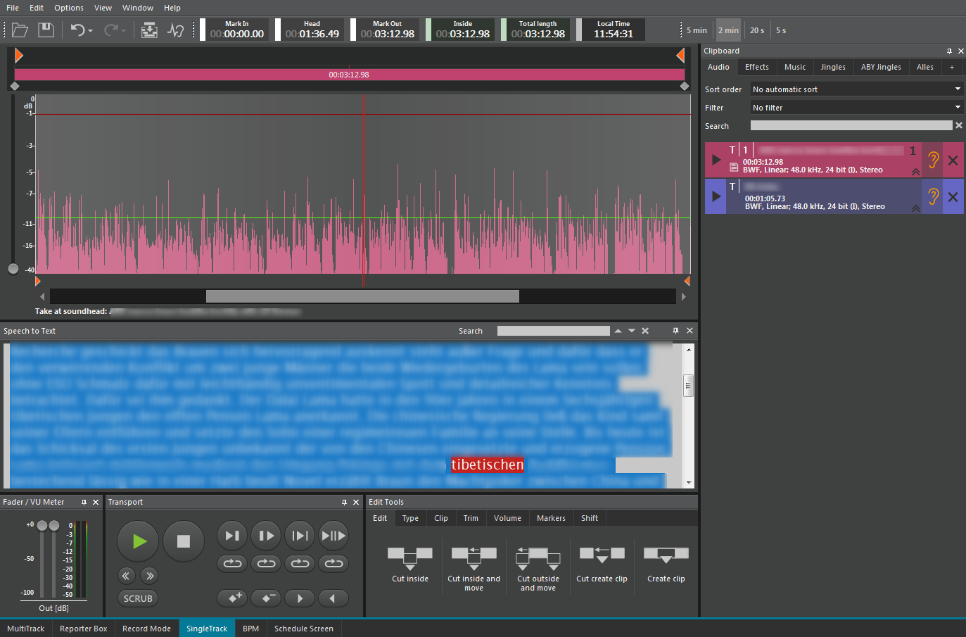 When analysis is finished successfully, the resulting text is attached to the audio. When you load the audio into the SingleTrack timeline, you can see the text in the speech to text pane. To see the speech to text pane, use the "View" menu.