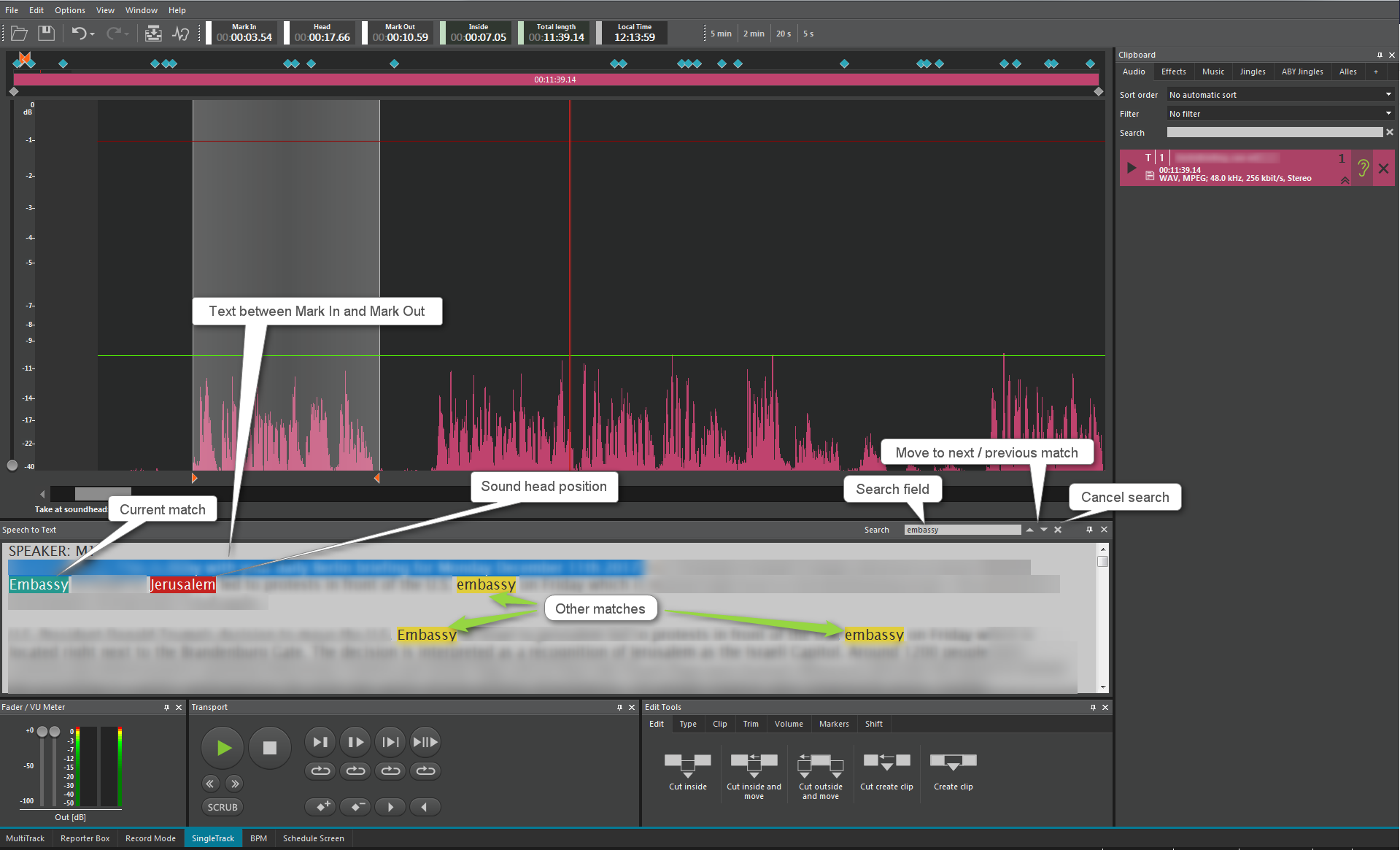 The highlighted text in the speech to text pane (blue background) corresponds to the area between mark in and mark out on the timeline.