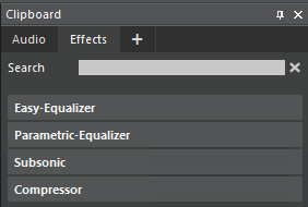 Here, the four standard effects Easy-Equalizer, Parametric-Equalizer, Subsonic filter and Compressor, and all installed DirectX and VST effects are shown.