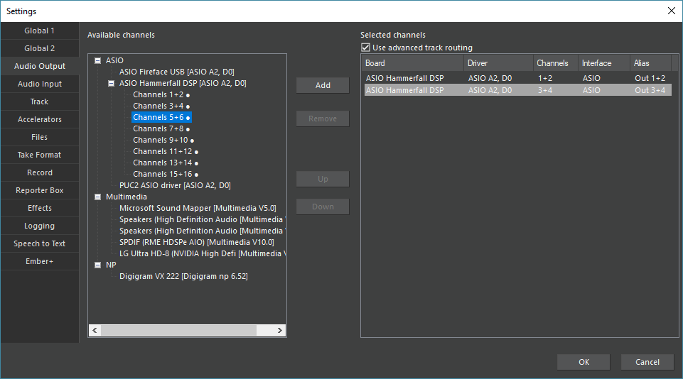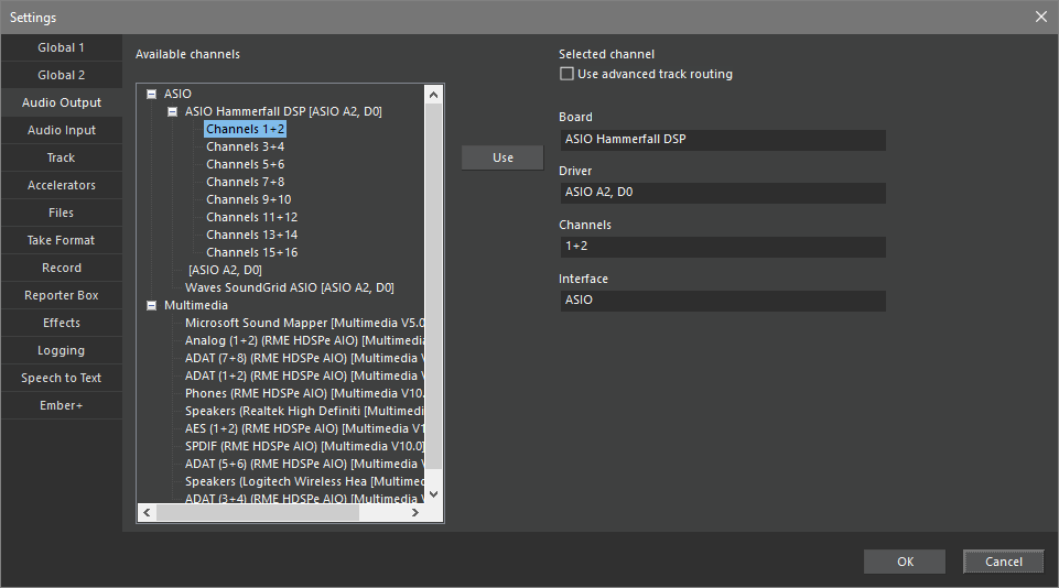 The Audio Output section contains a checkbox field under Selected channel called Use advanced track routing that switches between the usages of one channel pair (Stereo mode) or enables the advanced track routing functionality.