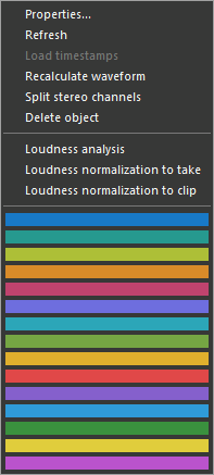 | Loudness normalization to take | Starts a loudness normalization. The correction gain is calculated into a newly rendered take, which appears at the bottom of the clipboard's list. |