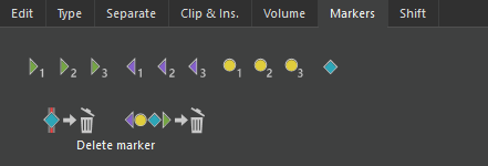 | Markers 1, 2, 3 different colors and symbols | Click on one of the marker symbols to add a respective marker at the current soundhead position. In MTS this is applied to the selected track. |