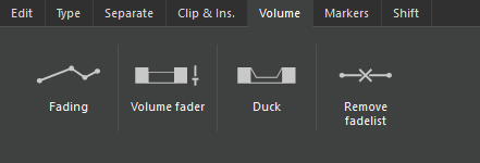 | Duck | Within the marked area the volume is decreased. In contrary to the Volume Fader there is a volume transition created, so there is no sudden volume change. |