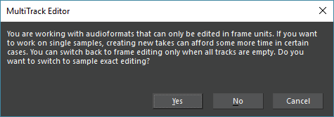 When switching to sample exact editing, there will be an info-window displayed, informing the user that it is only possible to switch back to frame exact editing when all tracks are empty. Background to this behavior is the technical track transformation into a sample exact format, which cannot be undone in the current session with the same files.