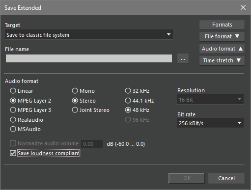 Show Loudness compliant checkbox in the audio save dialogs. The value 0 deactivates the check box feature, a value of 1 activates the check box and automatically selects it. With the value 2 the check box is available, but not checked. 3 means that the check box is selected and the user can not remove the check mark.
