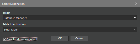 Checkbox_SaveLoudnessCompliant | <AppName>|Settings|Loudness | 2 | Determines whether the "Save loudness compliant" checkbox is visible in Save dialogs: 0=invisible; 1=visible and initially checked; 2=visible and initially unchecked |