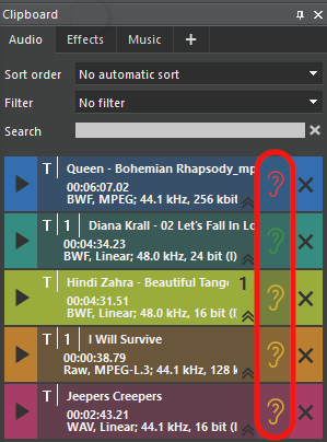 Any audio entry/file being loaded into the clipboard – this includes newly created takes/clips in the editor – will be checked for loudness data. If there are none, the editor automatically calculates the loudness data, which results in an Ear icon displayed in the field between the item info and the delete button. The ear color indicates the loudness state (see below).