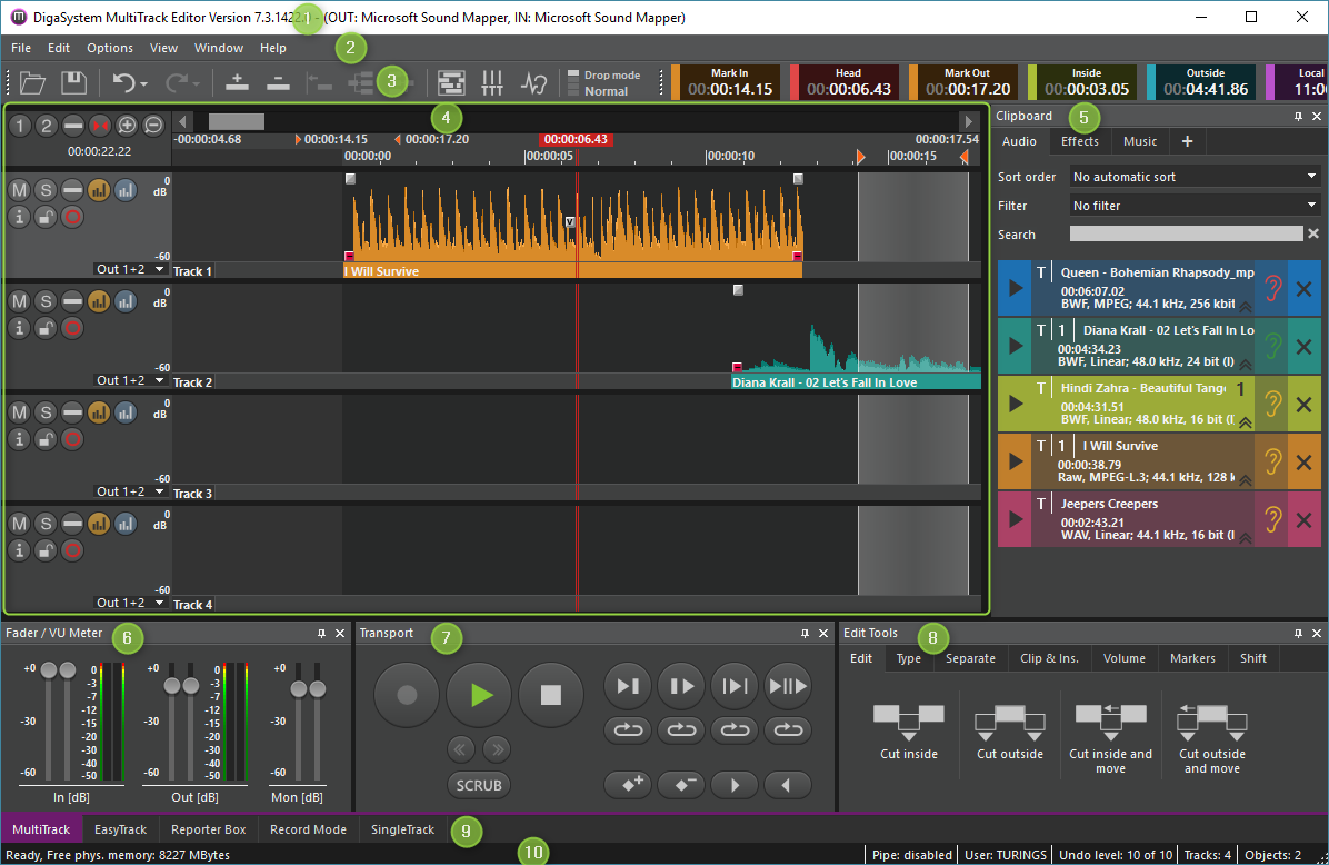 | 8 | Edit Tools pane | Offers many different tools to work on the audio timeline |