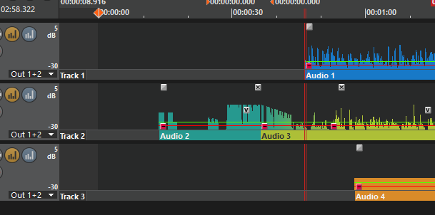 In the above example, all three tracks are selected. the accelerator affects "Audio 1" because the soundhead is between current trim in and trim out of Audio 1. It does not affect Audio 2 or Audio 3 because in track 2, both audios are at the soundhead position. Audio 4 is not affected because the soundhead is outside its trim in/out interval. The next picture shows the effect of the "Move Trim In to soundhead" accelerator.