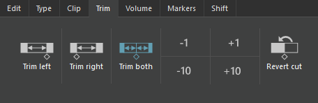 This trim function can be used to trim one or both edges of a cut edge. Set the soundhead to the cut position (e.g. by right-clicking the cut marker), then select the trim side (left, right or both), then use the +/- 1/10 buttons to shift the cut edges.