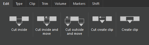 | Cut create clip | Creates a clip from the selected time range, which is added to the Clipboard with a user-defined title. Cut the selection off, then shift tracks' content to fill the gap. |