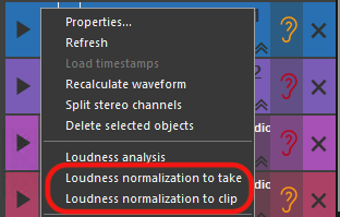 Any audio element in the clipboard can be normalized to loudness terms. This option is available for takes and clips and will perform a loudness analysis in case the element does not have loudness data yet. As a result, a new take/clip will be created for each object that goes through this process. The original file(s) will not be changed (non-destructive processing).