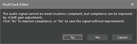 If the audio is “not correctable” the normalization will be done as close as possible to the “compliant” state. A message informs about the suggested volume adjustment.