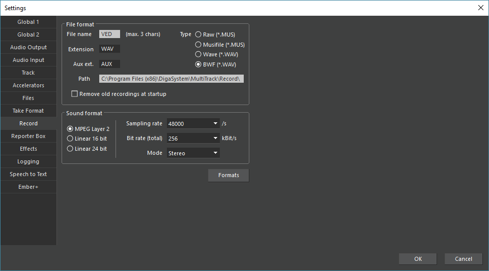 Under Formats audio format templates will be defined, which may then be selected in the Record Mode screen.