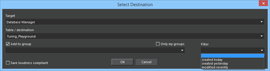 If you have worked with groups for some time, the list of groups will become lengthy, and it will be difficult to find the group you want to save into. Group filters can narrow the amount of displayed groups, based on the date of creation, or of the most recent modification of a group. Group filters can be configured per user (USER), per workstation (LOCAL), or globally (GLOBAL).