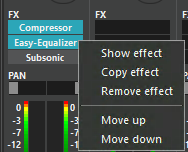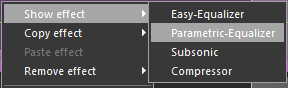 Here, the four standard effects Easy-Equalizer, Parametric-Equalizer, Subsonic filter and Compressor, and all installed DirectX and VST effects are shown.