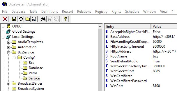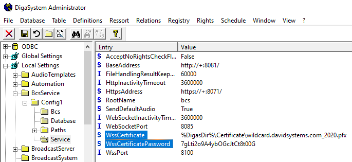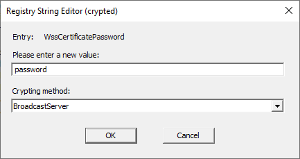 - Add the certificate password as value for the entry WssCertificatePassword encryped with the "BroadcastServer" format