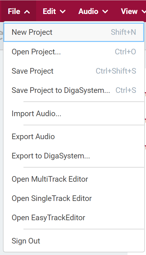 Opening MultiTrack, EasyTrack or SingleTrack Editor can be done through the File menu.