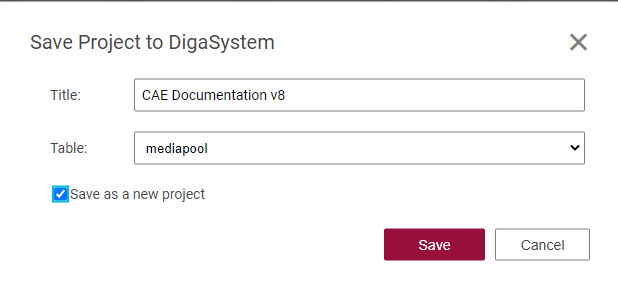 Currently all versions of a project are maintained within one DigaSystem entry, even if their title is different. If you want to save the project as new entry, use the checkbox "Save as new project".