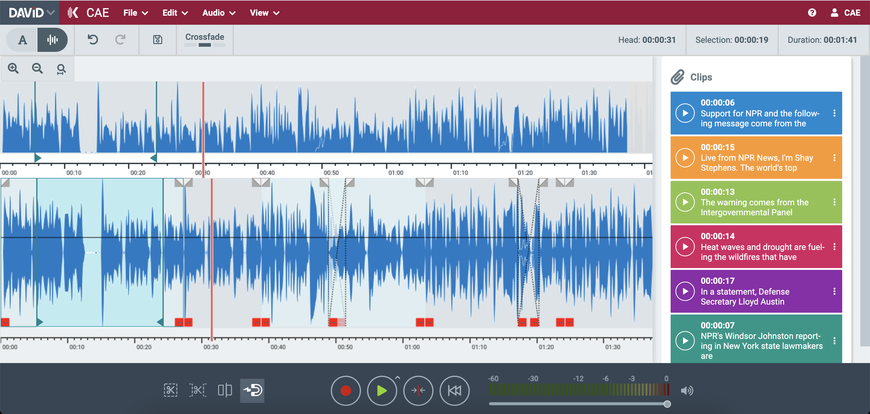The Waveform view offers traditional way of working with audio. This mode complements Text View with more granular control.