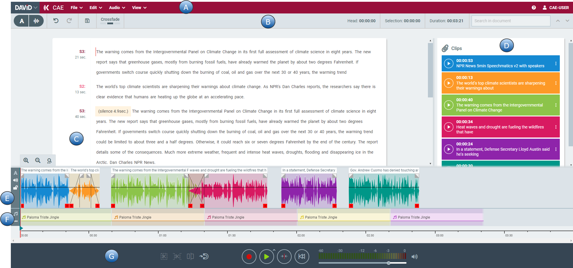Contextual Audio Editor, in short CAE, is a web application for Text-based audio editing. CAE can connect to various SpeechToText service providers and make full use of these services.