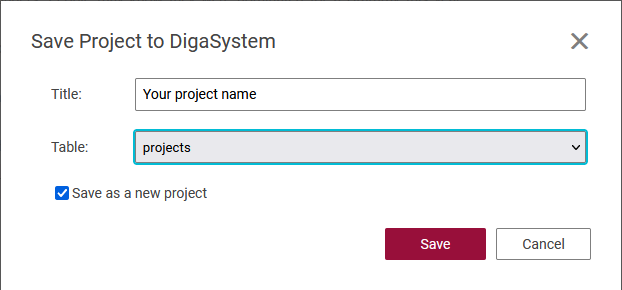 To save a project to a new DigaSystem entry check "Save as new project" button.