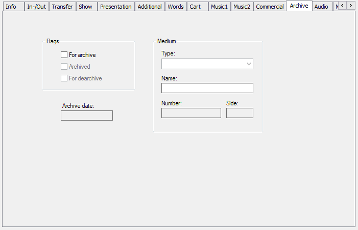 Flags | These check boxes allow the flags 'To be archived' and 'Archived' to be set which also sets the relevant marking in the table view. |
