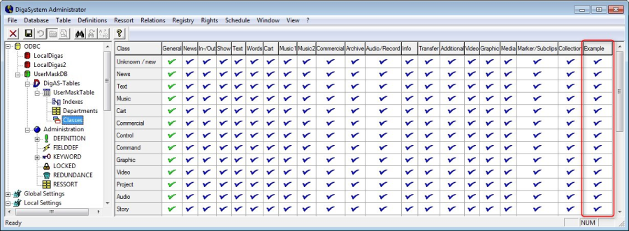 Close all DigaSystem applications and restart the DigaSystem Administrator. Connect to UserMaskDB in the ODBC section, enlarge the UserMaskTable key and click on "Classes". In the appearing list a column called "Example" should appear on the right (if it doesn't check the previous steps again). Set now some markers to make the tab available in DBM for this table.