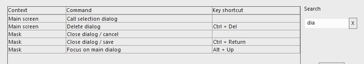 Each list row represents one function. The third column tells which key or key combination is assigned to this function. If this field is empty, no shortcut is assigned to the function.