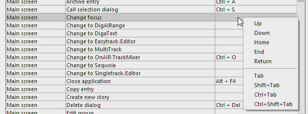 Other key combinations can be used, but we discourage their use, because they have standard meanings is almost every context. For example, the Tab key moves the focus across controls of a dialog, and the Up-arrow key moves the selection one line up. Assigning functions to those keys and key combinations can confuse users. Because of accessibility issues, you cannot enter such key combinations directly into the function list. Rather, right-click the third column in the respective row; this pops up a small menu from which you can pick additional key combinations.