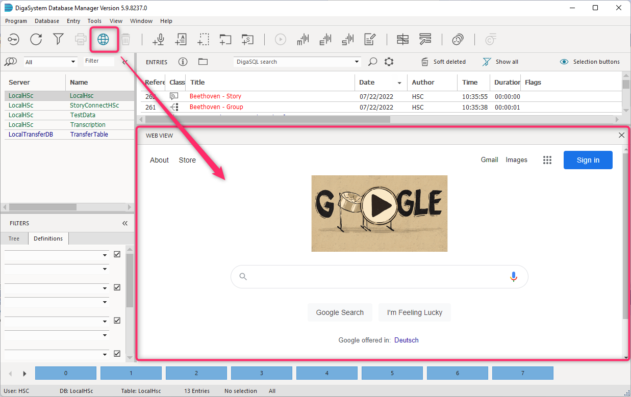 An administrator can configure DBM so that it displays a web page in the lower right pane. Since version 5.9.8238.0, DBM uses an Edge based browser view so that modern web features are fully supported. The following parameters must be defined: