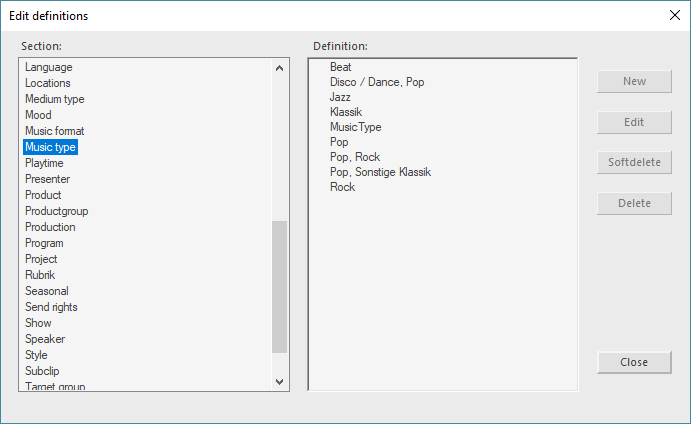 Click on any metadata field in the section field, e.g. "Music type". The Definition column lists up all available values for this field (in this case all names of Music type definitions) that are either predefined for this field and/or or are set in at least one entry of this table.