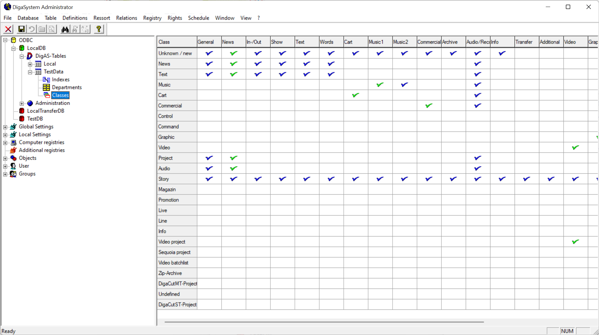 In the tree on the left side, open “ODBC”; double-click the database where the table is located, then navgate to “DigAS-Tables”, open the node for the table in question, and click “Classes”.