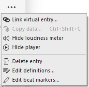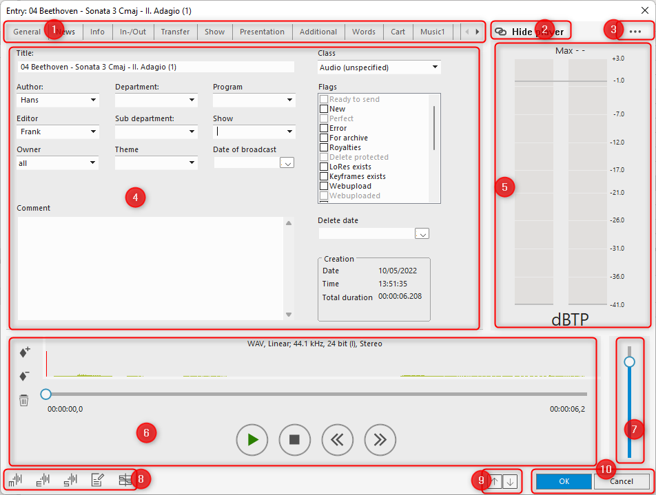 | 5 | The loudness meter is used during playback and recording. Only available if the entry contains audio. You can hide it interactively, and configuration controls whether it is initially displayed. |