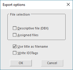 - Drag the file(s) with the right mouse button from the table into the destination application (e.g. Windows Explorer). All files being part of that entry will be placed at the destination location (normally at least the media file and the referring DBX file). Select the desired action.