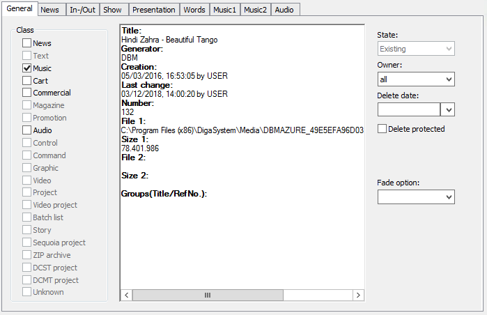 Class | The entry class can be changed if other classes are allowed in the current table. The class defines which tabs are available in the entry mask; e.g. the tab "Music1" might only be visible in the "Music" class, if defined accordingly. If an item of a class not permitted in a table is dragged to the table, a blocker cursor will be displayed to explain the conflict. |
