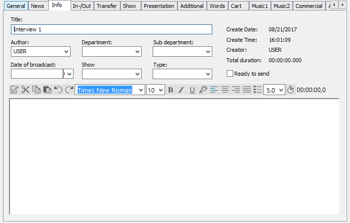 Ready to send | This checkbox marks this entry to be ready for broadcasting (also see 5.4 Entry Flags) |