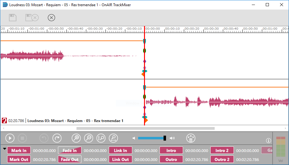 The OnAIR TrackMixer (OTM) is a simple tool to define crossfades in an audio entry and mark specific positions. Such editing is done to prepare an audio file to be broadcasted with TurboPlayer (and the BCS System). For more information, please refer to the TurboPlayer manual.