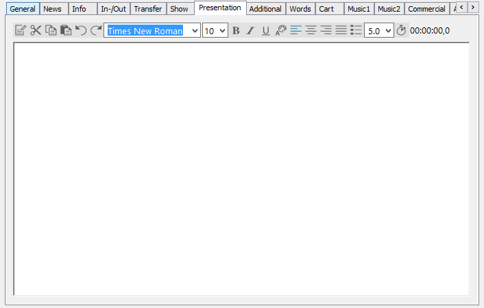 The presentation tab mainly contains a text field that is identical to the INFO tab's text field. Additionally some basic text edit tools are offered; the text is saved as rtf file in the entry. This tab is called TEXT in text entries.