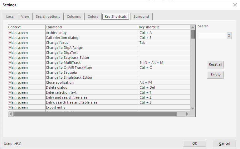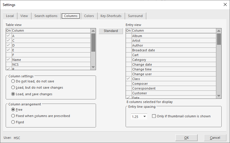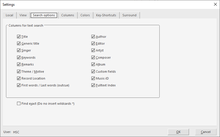 Columns for text search | Enables the appropriate columns to be included in the text search. C.f. Text search in Finding Entries |