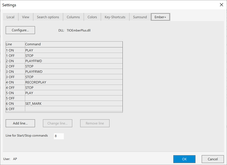 | Line for Start/Stop commands | The Ember+ protocol supports explicit "Start" and "Stop" commands on a specific line, distinct from fader movements. With "Line for Start/Stop commands", you can define the number of the line, whose "Start"/"Stop" commands are recognizes by DBM. Setting this to -1 disables the feature. |