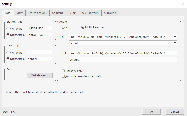 Station name | This parameter can only be changed on stand-alone workstations or when the specific right has been granted by the system. The entries are also available for the audio files which are recorded by this workstation. The station name can be either the predefined Windows station name or a special DigaSystem® station name. |