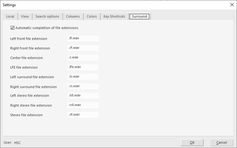 Automatic completion of file extensions: relevant for the "Import MCA file" function. If activated the here listed file names will be automatically assigned to the corresponding channels when creating a surround file. This means, when loading one file in a directory via the "Import MCA File" function, the other browsing fields will be completed according to these settings.
